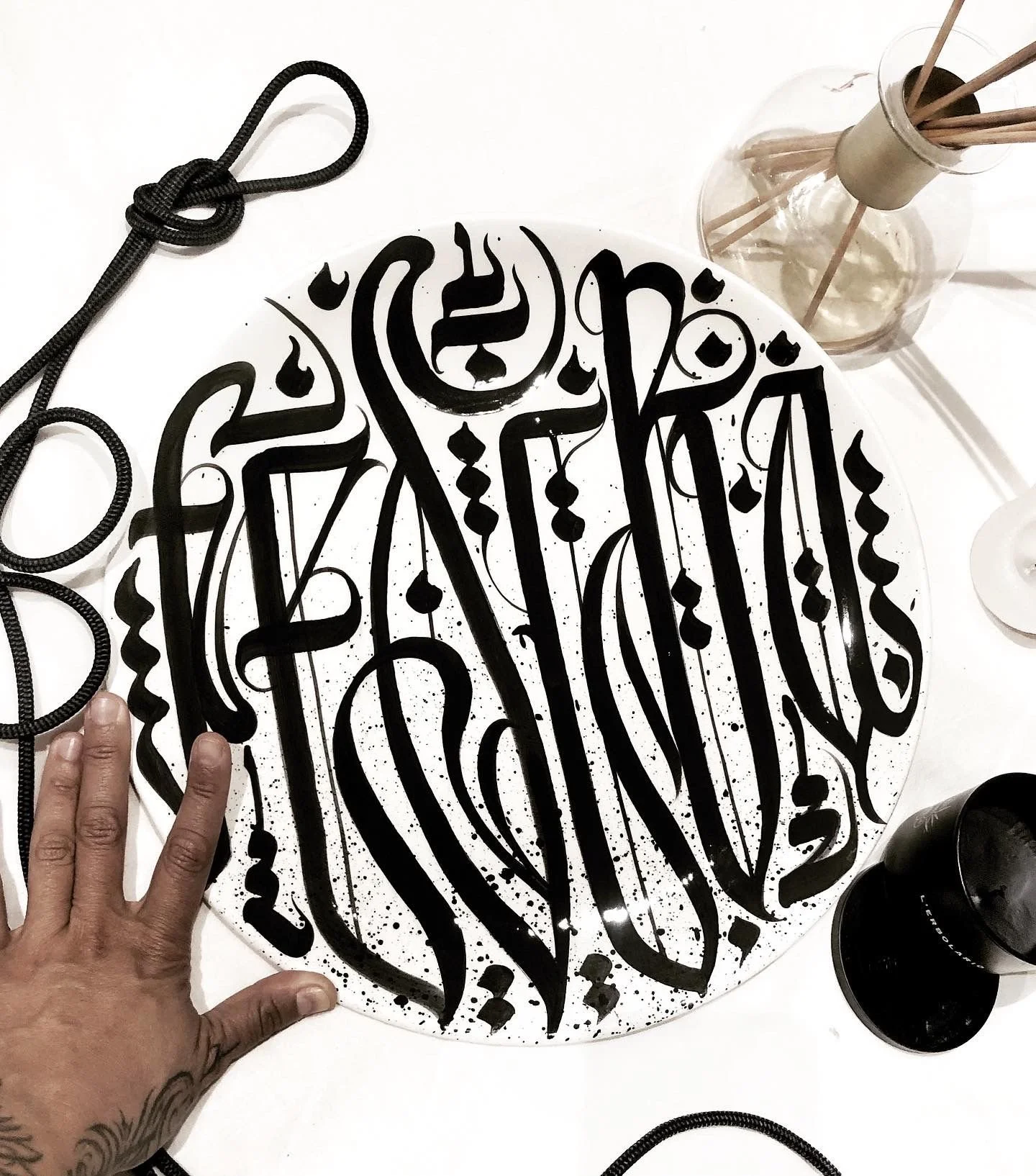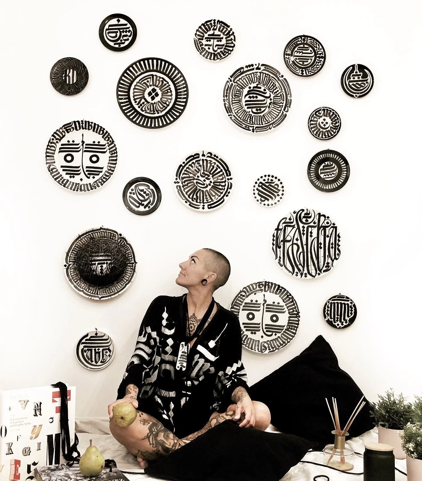 Delia traces letters across history and skin, blending Gothic forms with the fluidity of movement. Her work bridges personal memory and cultural heritage, drawing on childhood treasures and Mediterranean influences to create a visual language of inclusivity and wonder. These shapes carry stories of travel, curiosity, connections between worlds, and invite us to read with the eyes, the body, and the heart.